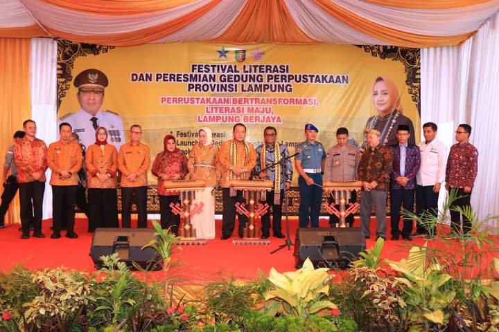 Gubernur Lampung Arinal Djunaidi didampingi Bunda Literasi Provinsi Lampung Riana Sari Arinal melakukan penandatanganan prasasti sebagai tanda peresmian Gedung Perpustakaan Provinsi Lampung sekaligus membuka kegiatan Festival Literasi Provinsi Lampung Tahun 2024, kegiatan dilaksanakan di halaman Gedung Perpustakaan Provinsi Lampung, Jl. Z.A Pagar Alam, Kedaton, Bandar Lampung, Kamis (02/05/2024).