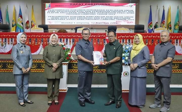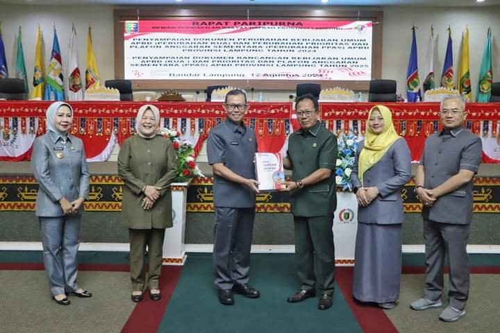 Sekretaris Daerah Provinsi Lampung Fahrizal Darminto dalam kesempatan tersebut menyerahkan Dokumen Rancangan Perubahan Kebijakan Umum APBD dan Prioritas Plafon Anggaran Sementara Tahun 2024 serta Dokumen Rancangan Kebijakan Umum APBD dan Prioritas Plafon Anggaran Sementara Tahun 2025 yang diterima secara langsung oleh Ketua DPRD Provinsi Lampung, Mingrum Gumay.