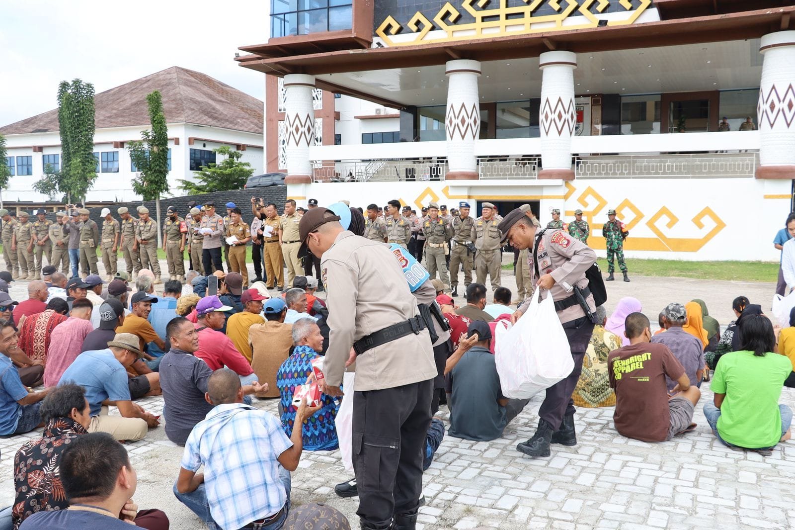 Polres Mesuji bersama TNI dan Sat Pol PP melaksanakan pengamanan aksi damai yang dilakukan oleh masyarakat Adat Mesuji di halaman Kantor Bupati Mesuji secara Humanis dalam rangka mendengarkan penyampaian hasil tindak lanjut atas tuntutan masyarakat Pribumi Mesuji Bersatu dari Kementrian Kehutanan terkait Lahan Register 45, Senin (13/01/25).