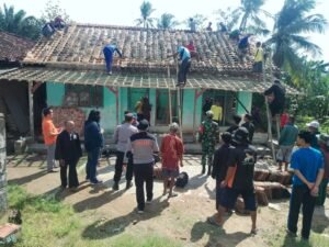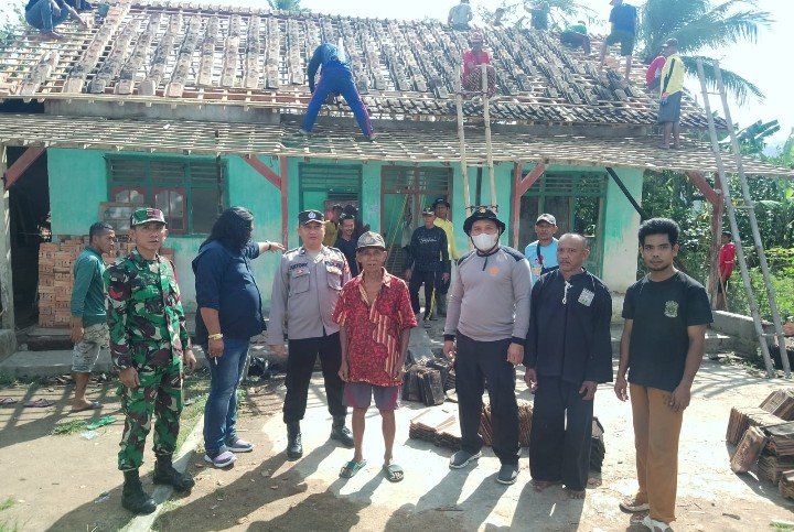 Kapolsek Kalirejo tidak hanya ikut gotong royong tetapi juga memberikan bantuan semen untuk perbaikan rumah kakek Misrun.
