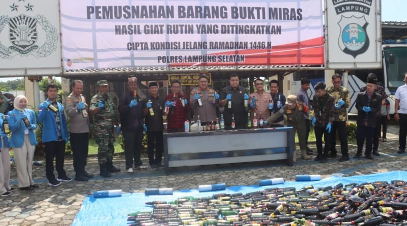 Kepolisian Resor (Polres) Lampung Selatan menggelar pemusnahan ratusan botol minuman keras (miras) sebagai langkah preventif dalam menjaga ketertiban menjelang bulan suci Ramadhan 1446 H.