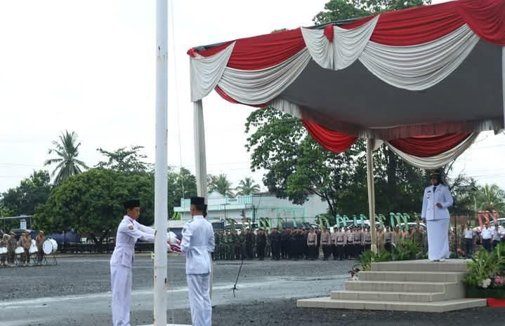 Bupati Lampung Timur Ela Siti Nuryamah, menjadi Inspektur Upacara Peringatah HUT Kabupaten Lampung Timur ke 26 Tahun, yang berlangsung di Halaman Depan Kantor Bupati Lampung TImur, senin (21/04/2025).