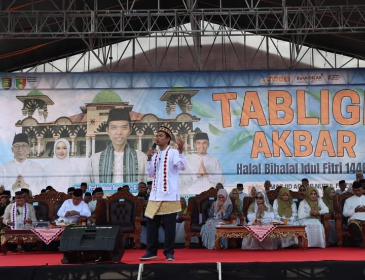Pemerintah Kabupaten (Pemkab) Tanggamus gelar tabligh akbar hadirkan Ustadz Prof. H. Abdul Somad, Lc., D.E.S.A., Ph.D., (UAS) sang penceramah kondang. Gelaran tersebut juga sebagai halal bihalal Idul Fitri 1446 Hijriah 2025, dilaksanakan di halaman masjid agung Nurul Faidzin Islamic Center Kota Agung, Sabtu (26/4/2025).