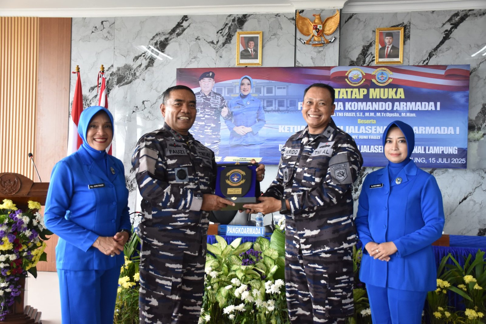 Komandan Pangkalan TNI Angkatan Laut (Danlanal) Lampung Letkol Laut (P) Krido Satriyo U, didampingi Ketua Cabang 3 Korcab III DJA I Ny. Nuke Krido Satriyo, menerima kunjungan kerja Panglima Komando Armada (Pangkoarmada) I, Laksamana Muda TNI Fauzi, S.E., M.M., M.Tr.Opsla., M.Han., didampingi Ketua Daerah Jalasenastri Armada I, Ny. Juni Fauzi, beserta rombongan, bertempat di Pangkalan TNI Angkatan Laut (Lanal) Lampung, Selasa ( 15 /7/2025.