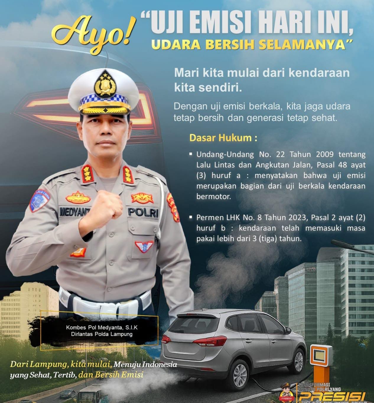 Dalam poster resmi yang dirilis Ditlantas Polda Lampung, Kombes Pol Medyanta menegaskan bahwa kendaraan bermotor merupakan salah satu kontributor utama pencemaran udara di wilayah perkotaan. Oleh karena itu, uji emisi secara berkala menjadi langkah nyata dalam menciptakan udara bersih dan menjaga kesehatan generasi masa depan.