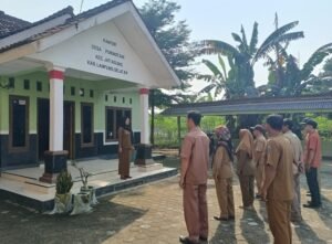 Kepala Desa Purwotani Kecamatan Jati Agung, Kabupaten Lampung Selatan, Maryatun memimpin apel pagi yang diadakan di halaman kantor balai desa pada Senin (11/8/2025).