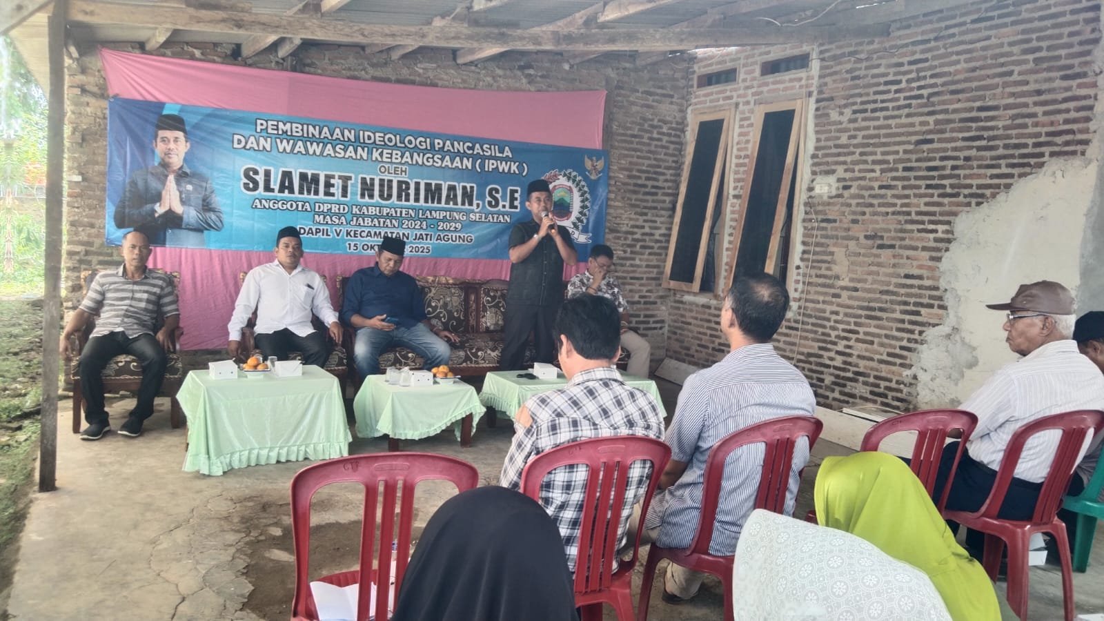 Anggota DPRD Lampung Selatan H. Slamet Nuriman, SE menggelar sosialisasi Ideologi Pancasila dan Wawasan Kebangsaan (IPWK) di Desa Karang Sari, Kecamatan Jati Agung, Lampung Selatan, Rabu (15/10/2025).