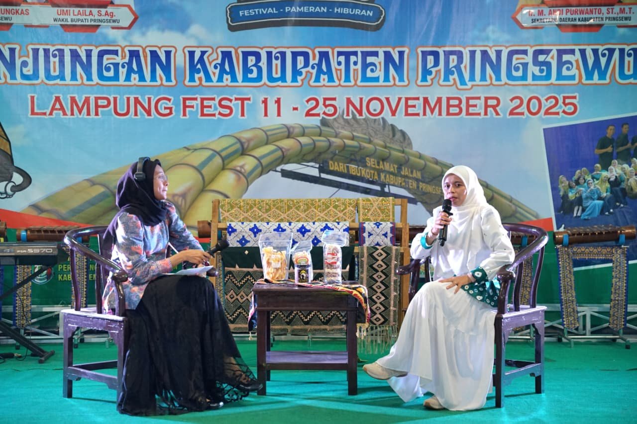 Ketua Dewan Kerajinan Nasional Daerah (Dekranasda) Kabupaten Pringsewu, Ny. Rahayu Riyanto Pamungkas, menjadi narasumber dalam Podcast bertema “Kerajinan, Kreativitas dan Identitas Pringsewu” yang digelar di Anjungan Kabupaten Pringsewu, PKOR Way Halim Bandar Lampung, pada Minggu (16/11/2025).