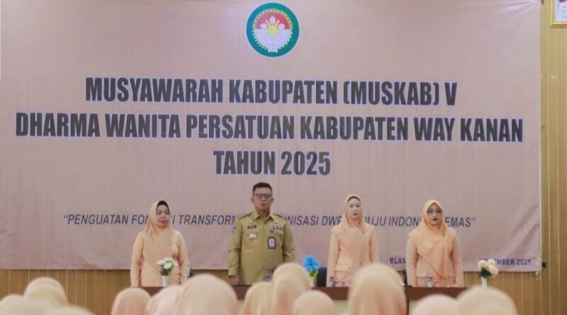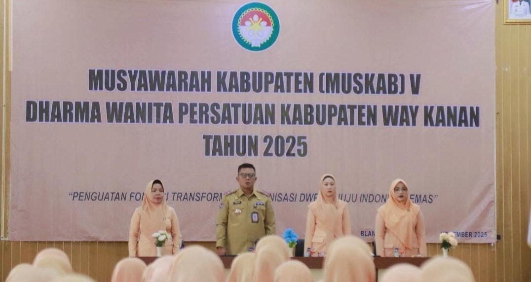 Bupati Way Kanan melalui Sekretaris Daerah Kabupaten Way Kanan, Machiavelli Herman Tarmizi, S.STP., M.Si., menghadiri sekaligus membuka Musyawarah Kabupaten (MUSKAB) Ke-V Dharma Wanita Persatuan (DWP) Kabupaten Way Kanan Tahun 2025, yang diselenggarakan di Gedung Pusiban Pemerintah Kabupaten Way Kanan, Selasa (18/11/2025). Machiavelli Herman Tarmizi meminta agar DWP bisa berkontribusi terhadap kabupaten Way Kanan.