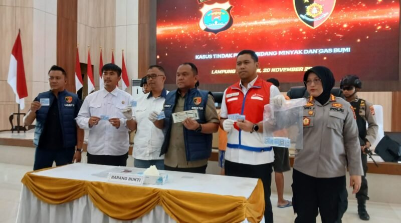 Anggota Subdit Direktorat Reserse Kriminal Khusus Polda Lampung bersama Polres Lampung Timur berhasil mengungkap kasus tindak pidana di bidang minyak dan gas bumi di wilayah Lampung Timur yang diekspos pada Kamis 39 Nopember 2025. di GSG Presisi Polda Lampung.