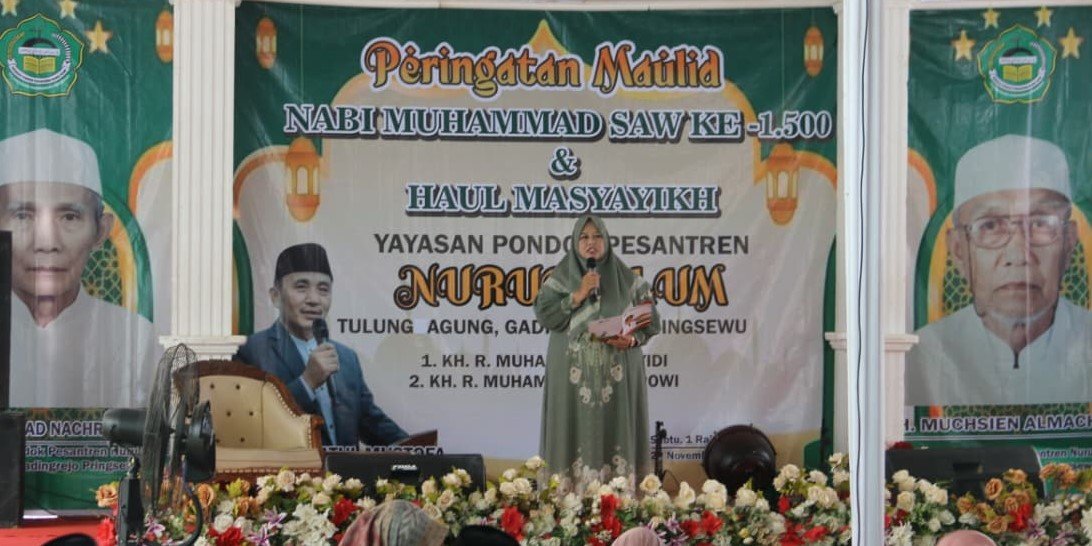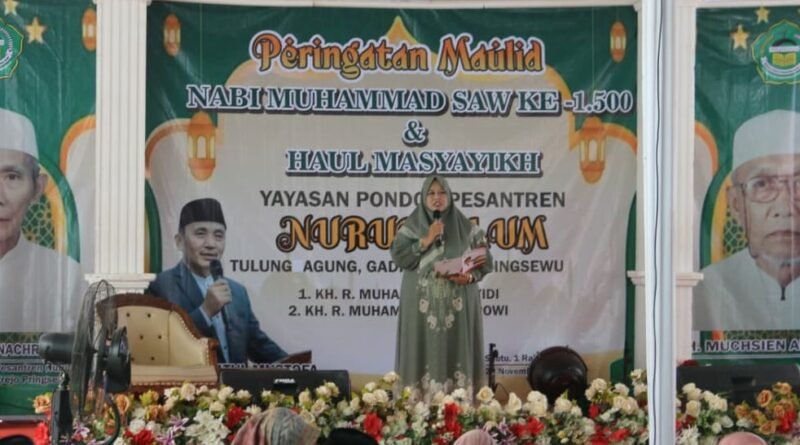 Wakil Bupati Pringsewu Umi Laila menghadiri Pengajian Peringatan Maulid Nabi Muhammad SAW dan Haul Masyayikh Pondok Pesantren Nurul Ulum di Pekon Tulung Agung, Kecamatan Gadingrejo, Sabtu (22/11/2025).