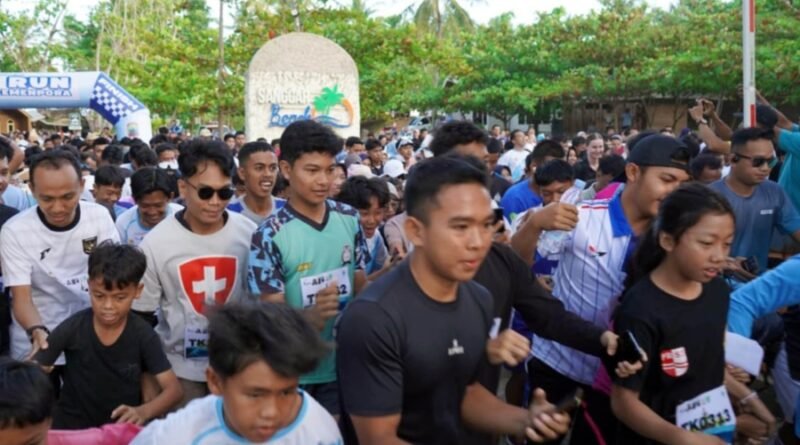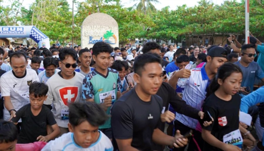 Ribuan peserta berdesakan memenuhi garis start FUN RUN Kejuaraan Antar Kampung (TARKAM) Kementerian Pemuda dan Olahraga 2025 di Sanggar Beach Kalianda, Minggu (30/11/2025).