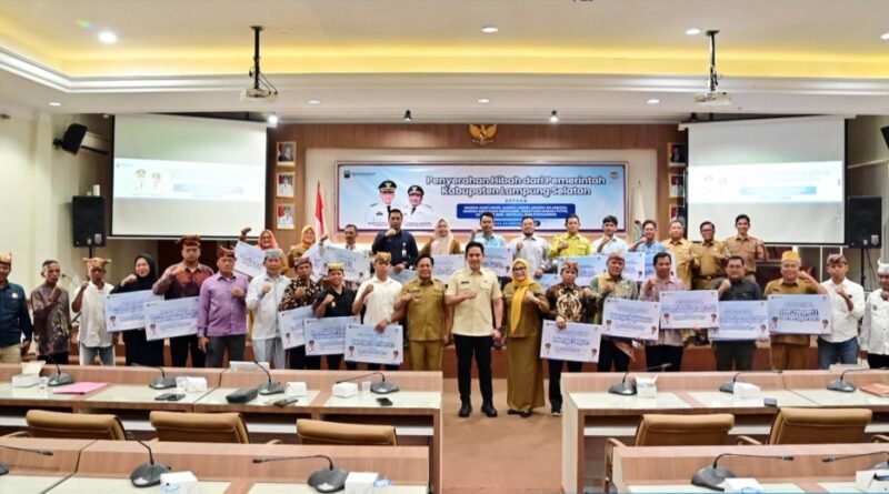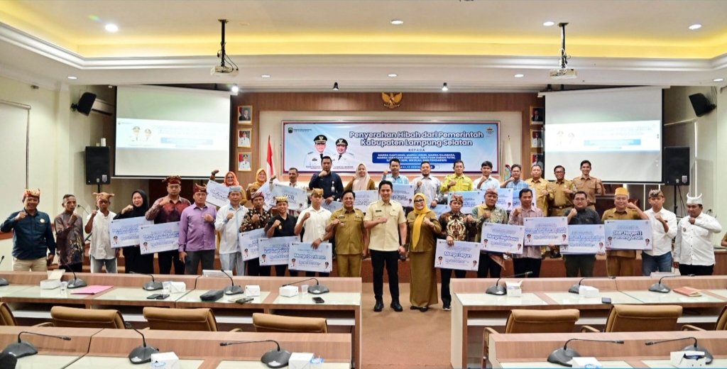 Bupati Lampung Selatan, Radityo Egi Pratama menyerahkan bantuan dana hibah kepada perwakilan Marga Dantaran, Marga Legun, Marga Rajabasa, Keratuan Darah Putih, Keratuan Menangsi, sanggar seni, satuan pendidikan, serta sejumlah Kelompok Sadar Wisata (Pokdarwis), di Aula Rajabasa, Kantor Bupati Lampung Selatan, Selasa (23/12/2025).