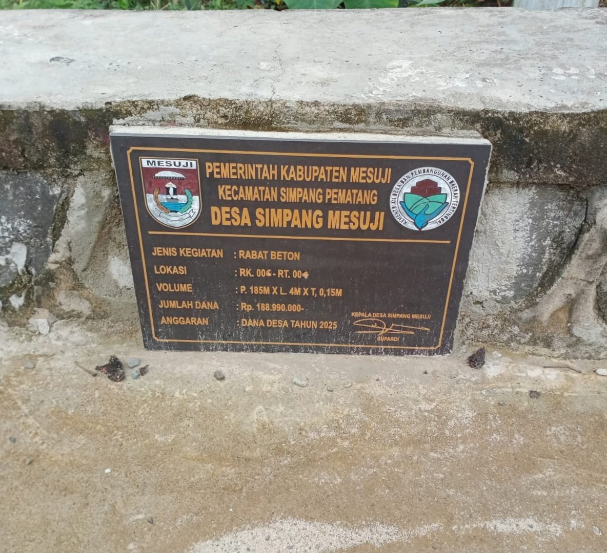 Pemerintah Kabupaten Mesuji, Kecamatan Simpang Pematang, Desa Simpang Mesuji telah menyelesaikan pembangunan infrastruktur berupa rabat beton. Proyek ini berlokasi di RK 006 RT 001 dengan spesifikasi sebagai berikut: