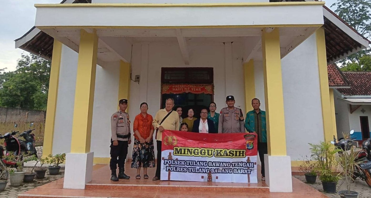 Personel Polsek Tulang Bawang Tengah, Polres Tulang Bawang Barat, melaksanakan pengamanan kegiatan ibadah Gereja dalam program Minggu Kasih di Gereja Kristen Sumatera Bagian Selatan (GKSBS) Immanuel, Kelurahan Panaragan Jaya, Kecamatan Tulang Bawang Tengah, Kabupaten Tulang Bawang Barat, Minggu (28/12/2025) pagi.