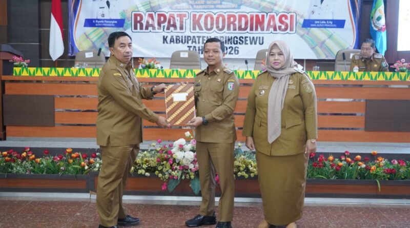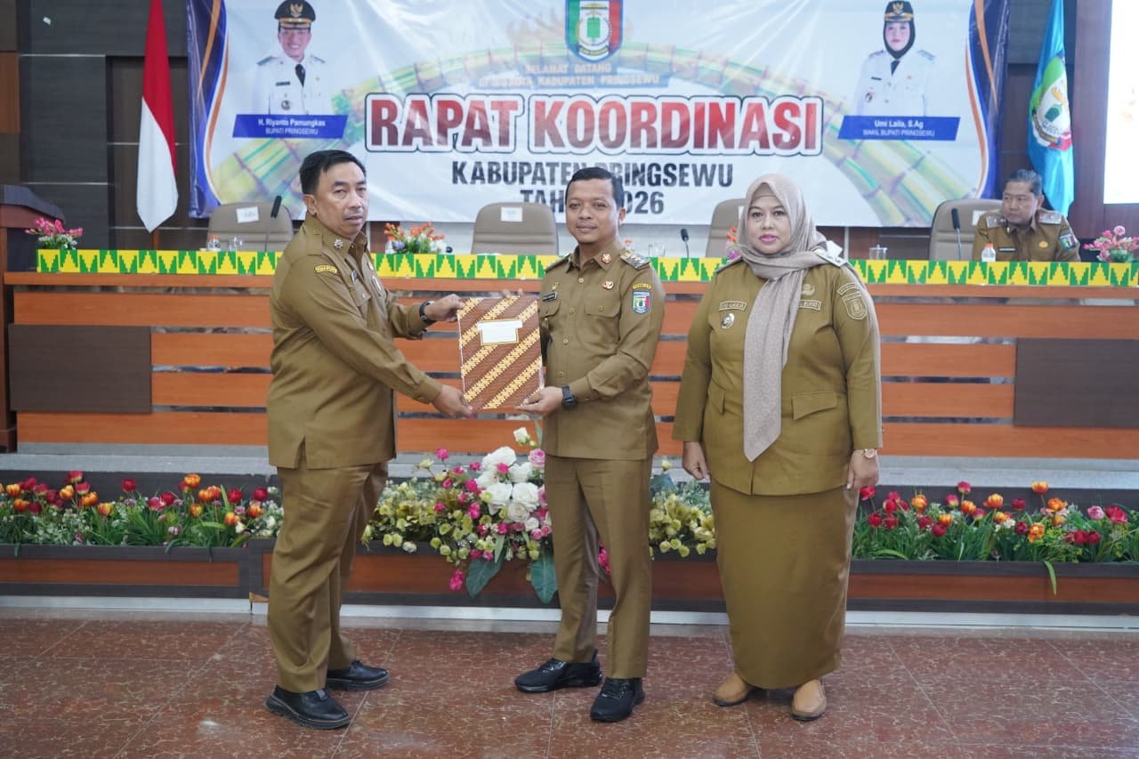 Pemerintah Kabupaten Pringsewu memulai tahun 2026 dengan menggelar Rapat Koordinasi sebagai sarana penyelarasan kebijakan dan langkah kerja seluruh perangkat daerah. Kegiatan yang berlangsung di Aula Utama Kantor Bupati Pringsewu, Senin (5/1/2026), sekaligus menjadi momentum Bupati Pringsewu H. Riyanto Pamungkas menyerahkan Dokumen Pelaksanaan Anggaran (DPA) Tahun Anggaran 2026 kepada para kepala organisasi perangkat daerah.