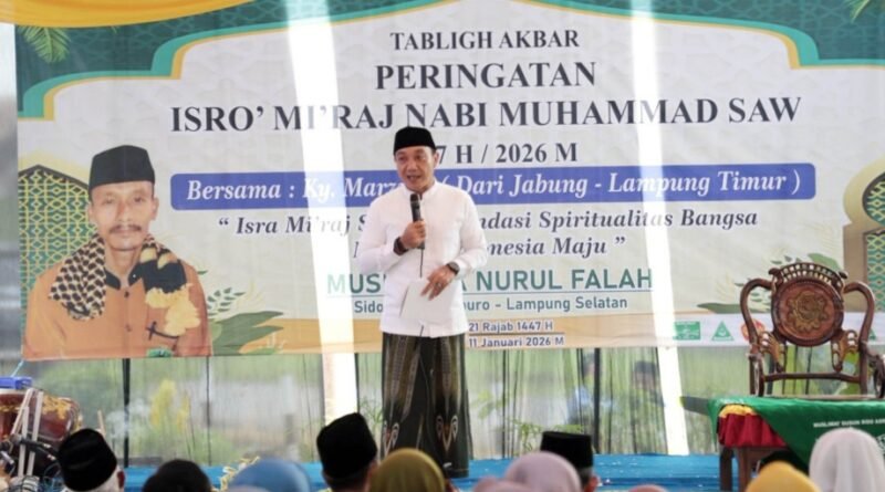 Wakil Bupati (Wabup) Lampung Selatan, M. Syaiful Anwar, menghadiri Tabligh Akbar dalam rangka Peringatan Isra Mikraj Nabi Muhammad SAW 1447 Hijriah yang digelar di Mushola Nurul Falah, Desa Sidoasri, Kecamatan Candipuro, Minggu (11/1/2026).
