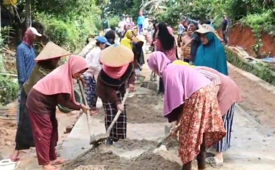 Dengan semangat gotong royong, Minggu (11/1/2026) siang, mereka melakukan pengecoran jalan rusak yang selama bertahun-tahun tidak kunjung diperbaiki pemerintah. Dengan menggunakan peralatan seadanya, para mak-mak bahu membahu mengecor jalan dengan bahan material yang diperoleh secara swadaya.