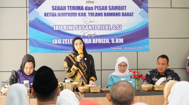 Bunda PAUD Kabupaten Tulang Bawang Barat, Ny. Novianti Novriwan, menghadiri acara serah terima jabatan Ketua Pengurus Daerah Himpunan Pendidik dan Tenaga Kependidikan Anak Usia Dini Indonesia Kabupaten Tulang Bawang Barat di Aula Dinas Pendidikan dan Kebudayaan Kompleks Uluan Nughik, Jumat (30/1/2026).