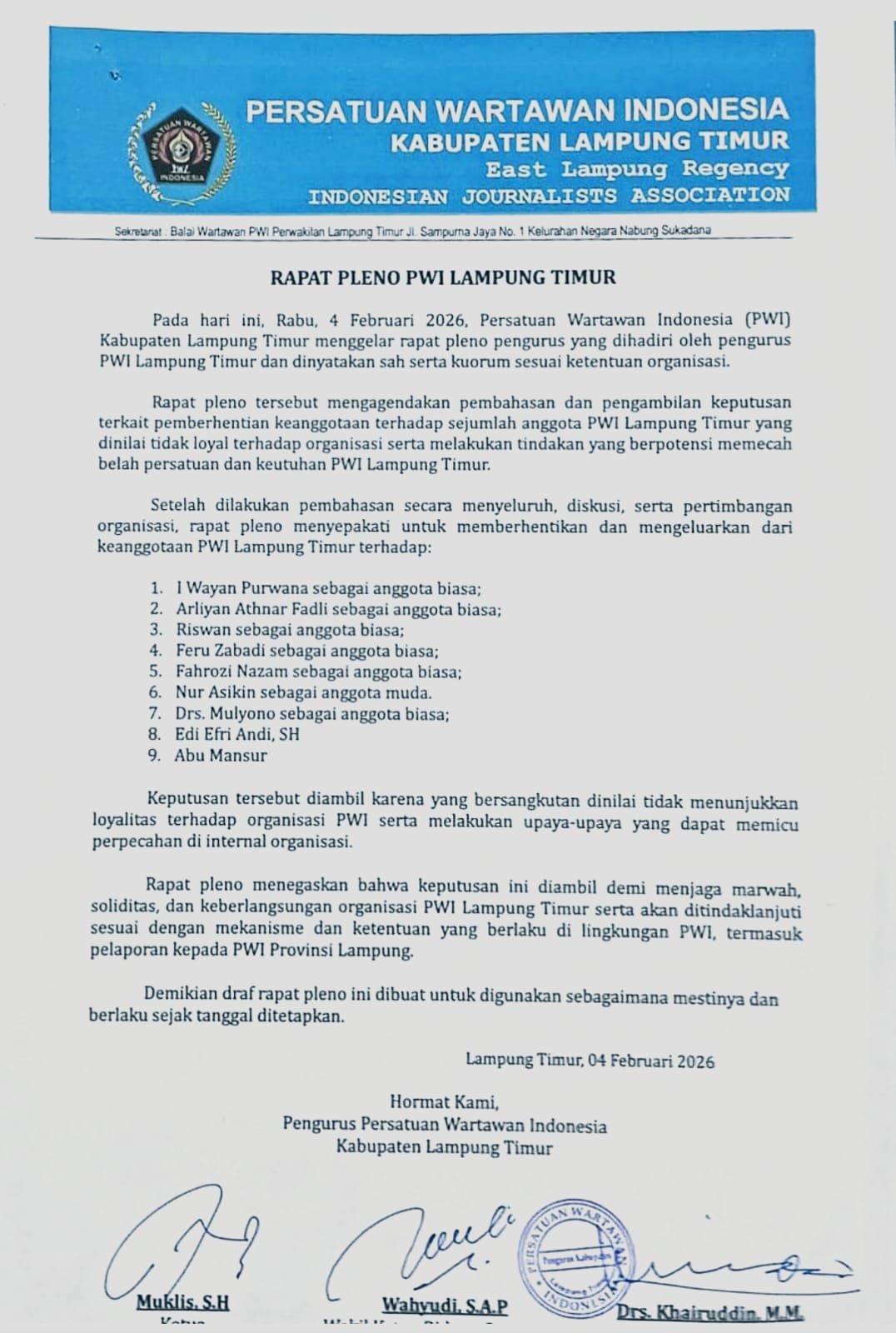Sedangkan sudah jelas dalam isi surat pleno PWI Lampung Timur pada hari Rabu tanggal 4 Februari 2026 terkait pemberhentian keanggotaan terhadap 9 orang anggota PWI Lamtim, meskipun terkesan PWI Provinsi Lampung membela muklis, akan tetapi menganulir surat pleno PWI Lamtim yang memberhentikan 9 anggota PWI Lamtim.