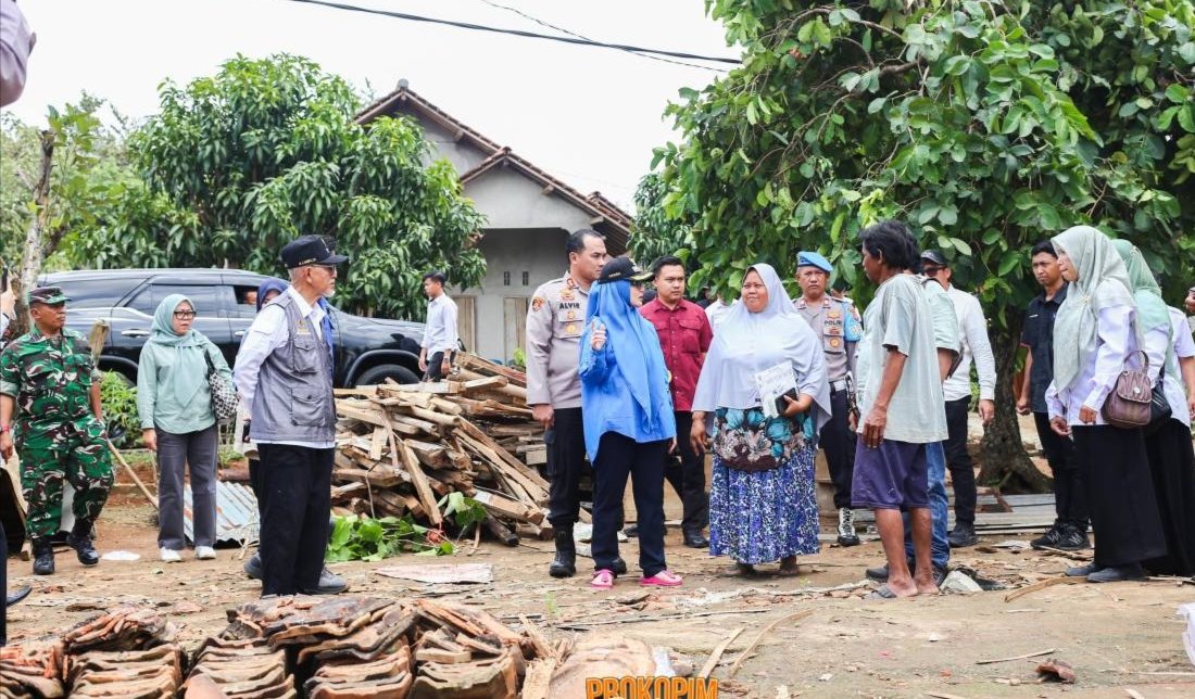 Bupati bersama Wakil Ketua I DPRD Kabupaten Pesawaran didampingi Kapolres dan jajaran Pejabat Utama Polres Pesawaran, Kepala Pelaksana BPBD Kabupaten Pesawaran, Kepala Dinas Sosial, serta jajaran terkait. Bupati berdialog langsung dengan warga dan meninjau kondisi rumah yang mengalami kerusakan, terutama pada bagian atap yang terangkat akibat terjangan angin.