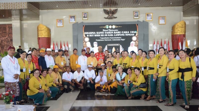 Pelaksana Tugas (Plt) Bupati Kabupaten Lampung Tengah I Komang Koheri menghadiri kegiatan Dharma Santi Tahun Baru Caka 1948 sekaligus peringatan Hari Ulang Tahun Wanita Hindu Dharma Indonesia (WHDI) ke-38 Kabupaten Lampung Tengah yang digelar di Gedung Sesat Agung Nuwo Balak Gunung Sugih, Minggu (29/03/2026).