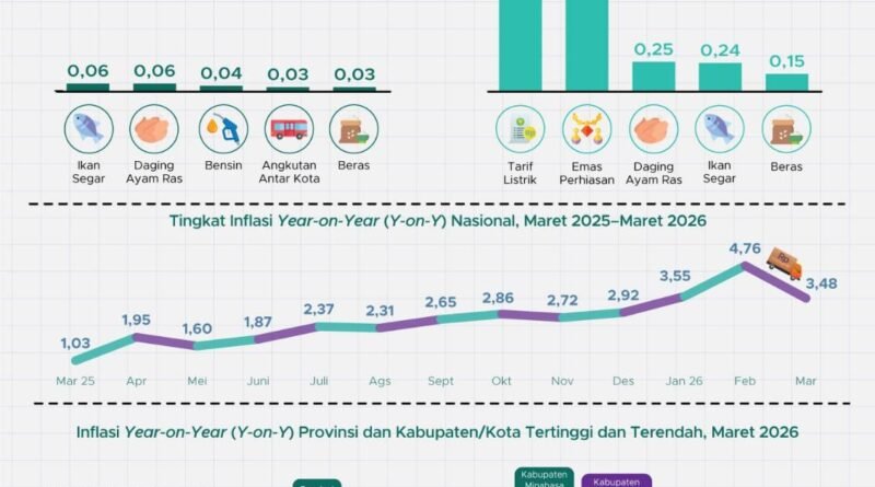 Perkembangan Indeks Harga Konsumen (IHK) pada Maret 2026 menunjukkan tren inflasi yang tetap terkendali, baik di tingkat nasional maupun daerah. Data resmi yang dirilis Badan Pusat Statistik mencatat inflasi bulanan (month-to-month) sebesar 0,41 persen, inflasi tahun kalender (year-to-date) sebesar 0,94 persen, dan inflasi tahunan (year-on-year) sebesar 3,48 persen.